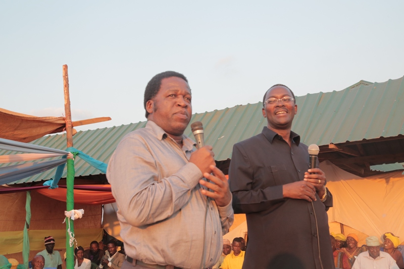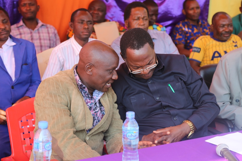 Waziri Nchi Ofisi ya Makamu wa Rais (Muungano na Mazingira), Mhe. George Simbachawene akijadiliana jambo na Mkurugenzi Mtendaji wa Halmashauri ya Wilaya ya Mpwapwa James Sweya wakati wa mkutano wa hadhara Kijiji cha Pwaga wilayani humo.
