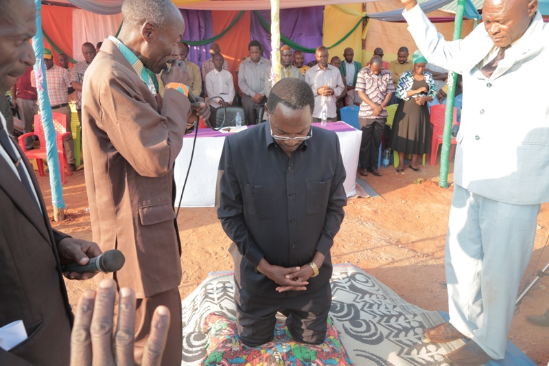 Waziri Nchi Ofisi ya Makamu wa Rais (Muungano na Mazingira), Mhe. George Simbachawene akiombewa na viongozi wa dini wakati wa mkutano wa hadhara Kijiji cha Pwaga wilayani Mpwapwa.