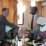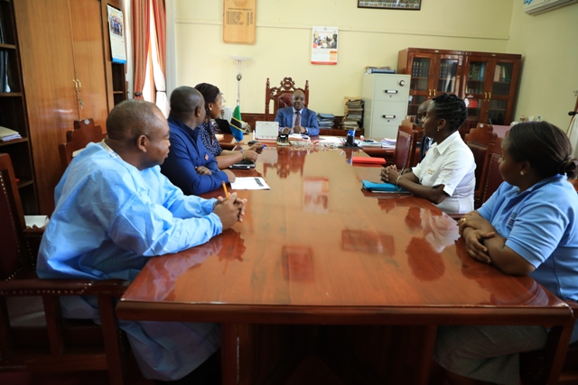 Jaji Kiongozi wa Mahakama Kuu ya Tanzania, Mhe. Dkt. Eliezer Feleshi (katikati) akipatiwa elimu kuhusu upimaji wa ugonjwa wa homa ya ini leo na Daktari Bingwa vya Virus vya Saratani, Kandali Samweli (wa pili kulia) kutoka Taasisi ya Saratani Ocean Road iliyopo jijini Dar es Salaam wakati wa kampeni ya upimaji wa hiari wa ugonjwa huo unaofanyika kwa Watumishi wa Mahakama Kuu na Mahakama Kuu Kanda ya Dar es Salaam, ambapo unaofanyika kwa muda wa siku tatu katika ukumbi wa Mahakama Kuu jijini Dar es Salaam.