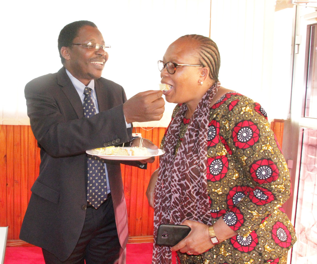 Katibu Mkuu Ofisi ya Waziri Mkuu (Sera na Uratibu)Bi. Dorothy Mwaluko, akilishwa keki na aliyekuwa Mkurugenzi Idara ya Uwekezaji , Cleophas Ruhumbika ambaye amestaafu, wakati wa kumpongeza kwa kustaafu rasmi utumishi wake wa Umma leo, tarehe 21, Septemba, 2019.