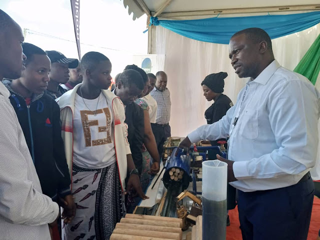 Mkurugenzi wa Qwihaya, Leonard Mahenda akiwaelekeza wananchi wa Iringa waliotembelea banda lake la maonyesho namna wanavyoandaa nguzo za umeme.