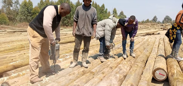 Mkurugenzi wa Qwihaya, Leonard Mahenda akisaidia wafanyakazi kutoboa nguzo za umeme