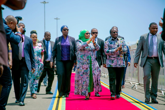 Makamu wa Rais wa Jamhuri ya Muungano wa Tanzania, Mheshimiwa Samia Suluhu Hassan (kushoto) akisalimia wananchi mara baada ya kufika uwanja wa Uhuru jijini Dar es Salaam, Tanzania katika ufunguzi wa JAMAFEST.