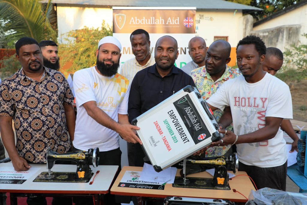 Naibu Waziri wa Mambo ya Ndani ya Nchi, Mhandisi Hamad Masauni (watatu kulia), Mjumbe kutoka Shirika la Kuwawezesha Vijana la Abdullah, Abdallah Mrusi (wanne kulia) wakimkabidhi Hussein Ally (wakwanza kulia), kifaa maalumu wakati wa kukabidhi vifaa mbalimbali kwa vijana wajasiriamali ikiwa na lengo la kuwasaidia kukuza vipato vyao na kuwaweka mbali na makundi hatarishi.Hafla hiyo imefanyika Visiwani Zanzibar.Picha na Wizara ya Mambo ya Ndani ya Nchi