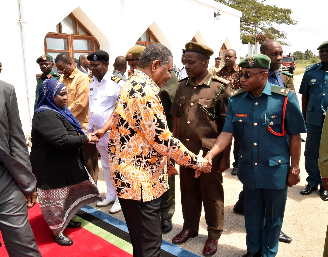 RAIS wa Zanzibar na Mwenyekiti wa Baraza la Mapinduzi Mhe. Dk. Ali Mohamed Shein na Mkewe Mama.Mwanamwema Shein, wakisalimiana na Wakuu wa Vyombo vya Ulinzi na Usalama Zanzibar,katika Uwanja wa Ndege wa Kimataifa wa Abeid Amani Karume Zanzibar,wakati akiondoka Nchini leo kuelekea Ras Al Khaimah katika Umoja wa Nchi za Kiarabu (UAE) kwa ziara ya wiki moja (Picha na Ikulu)