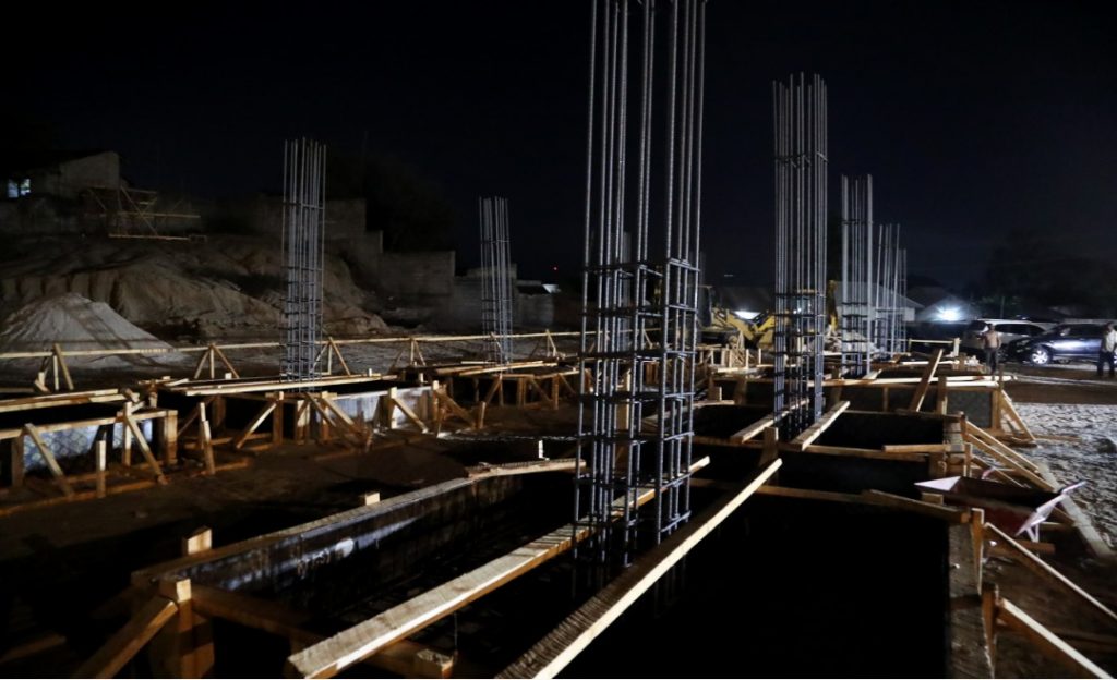 Mkuu wa Mkoa wa Dar es Salaam Mh.Paul Makonda akikagua zege lililomiminwa katika nondo kwaajili ya ujenzi wa machinjio ya kisasa ya Vingunguti jijini Dar es Salaam baada ya kutembelea na kusimamia ujenzi huo jana usiku.