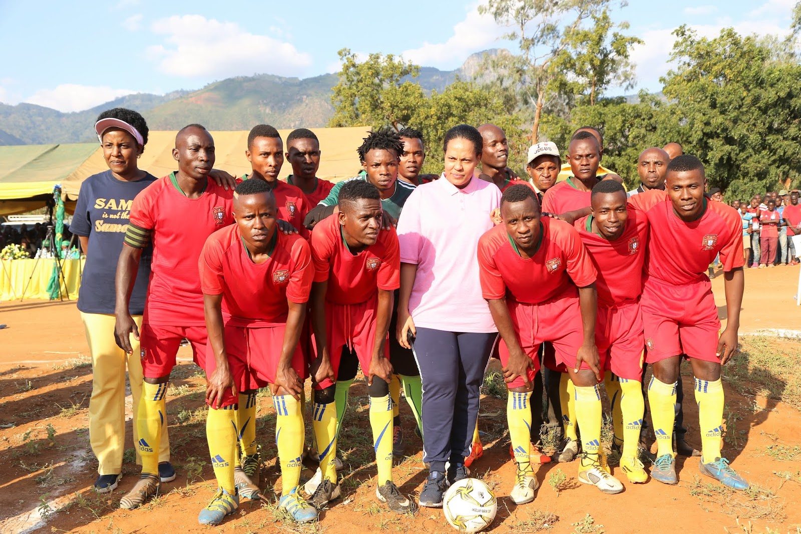 Mgeni rasmi ,Waziri Kairuki akiwa katika picha ya pamoja na kikosi cha Ujamaa fc kabla ya kuanza kwa mchezo wa fainali kwa timu hizo ,kulia ni mkuu wa wilaya ya Same,Rosemery Senyamule na kushoto ni Mwenyekiti wa Chama cha Mapinduzi (CCM) Isaya Mungulu.