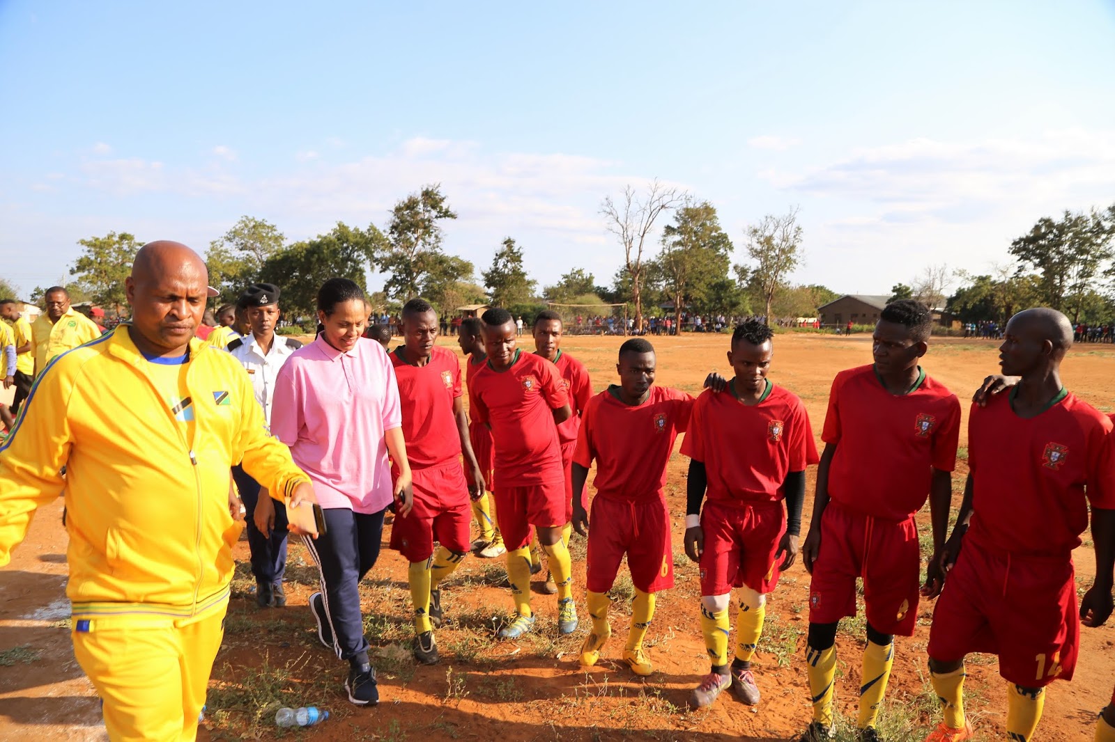 Waziri Kairuki akisalimiana na wachezaji wa timu ya soka ya Ujamaa fc Kabla ya kuanza kwa mchezo wa fainali.