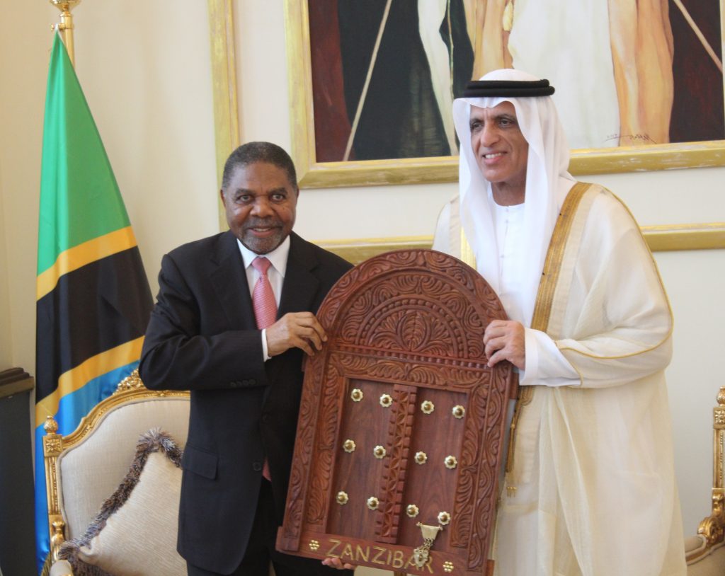 RAIS wa Zanzibar na Mwenyekiti wa Baraza la Mapinduzi Mhe.Dk. Ali Mohamed Shein, akimkabidhi mlango wa Zanzibar mwenyeji wake Mtawala wa Ras Al Khaimah Sheikh Saud Bin Alqasimi, baada ya kumaliza mazungumzo yao yaliofanyika katika makaazi yake Ras Al Khaimah,leo 23/9/2019.(Picha na Ikulu) .