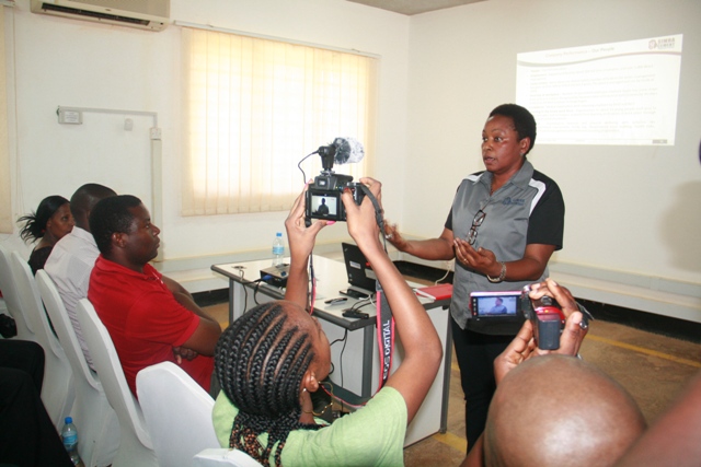 Meneja Rasilimali Watu wa Kiwanda cha Tanga Cement Bi. Diana Malambugi akitoa mada kwa wahariri wa vyombo vya habari na waandishi wa habari katika kikao hicho.