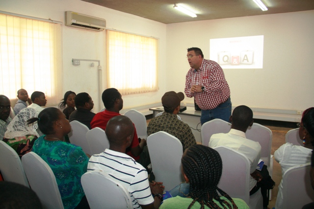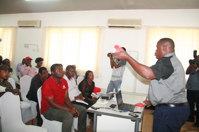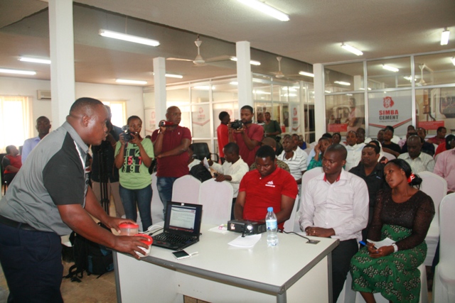 Injinia Gadiel Benjamin wa Kiwanda cha Tanga Cement akionesha sampuli za udongo na madini ya aina ya Limestone yanayotumika kutengenezea Saruji. katika kiwanda hicho wakati alipotoa mada kuhusu uzalishaji wa Saruji.