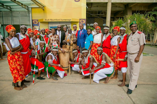 Balozi wa Burundi katika Jamhuri ya Muungano wa Tanzania Bw. Gervais Abayeho (kulia) akisalimiana na wacheza ngoma kutoka nchini Burundi waliokuja kushiriki katika Tamasha la Sanaa na Utamaduni la Jumuiya ya Afrika Mashariki linalojulikana kama JAMAFEST linalofanyika jijini Dar es Salaam, Tanzania.