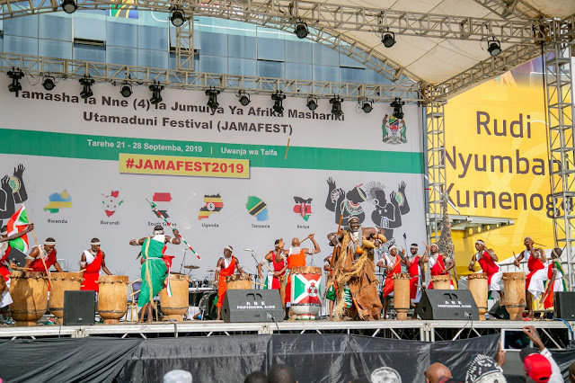 Wacheza ngoma kutoka nchini Burundi wakitoa burudani katika Tamasha la Sanaa na Utamaduni la Jumuiya ya Afrika Mashariki linalojulikana kama JAMAFEST linalofanyika jijini Dar es Salaam, Tanzania.