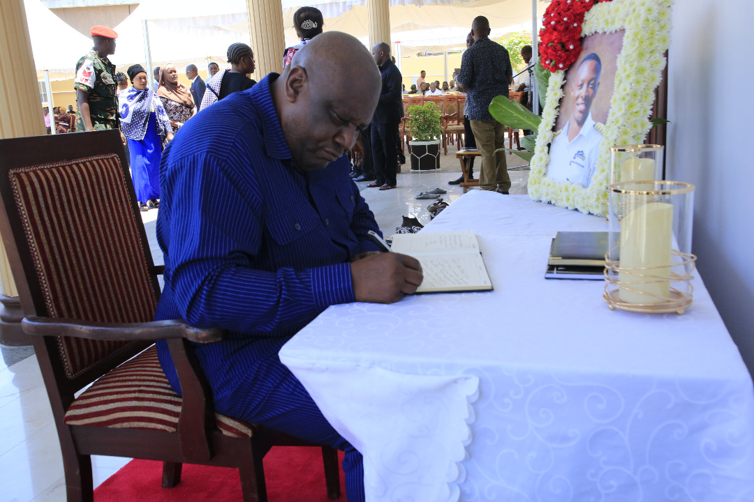 Waziri wa Mambo ya Ndani ya Nchi, Kangi Lugola (kushoto) akisaini kitabu cha maombolezo ya kmifo cha Nelson Mabeyo, mtoto wa Mkuu wa Majeshi nchini, Jenerali Venance Mabeyo, nyumbani kwa Mkuu wa Majeshi, Msasani jijini Dar es Salaam, leo Septemba 24, 2019.