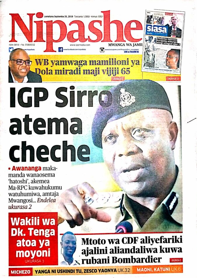 MagazetiPITIA VICHWA VYA HABARI KATIKA MAGAZETI YA LEO JUMATANO SEPTEMBER 25,2019 Last updated: 2019/09/25 at 3:39 AM Alex Sonna 7 years ago Share SHARE Alex Sonna September 25, 2019 September 25, 2019 Share this Article Facebook Twitter Email Print Previous Article KAMATI YA BUNGE YATEMBELEA SOKO LA MADINI KATORO Next Article DC Ndejembi Acharuka, Aagiza TAKUKURU kuchunguza Miradi Miwili Wilayani kwake