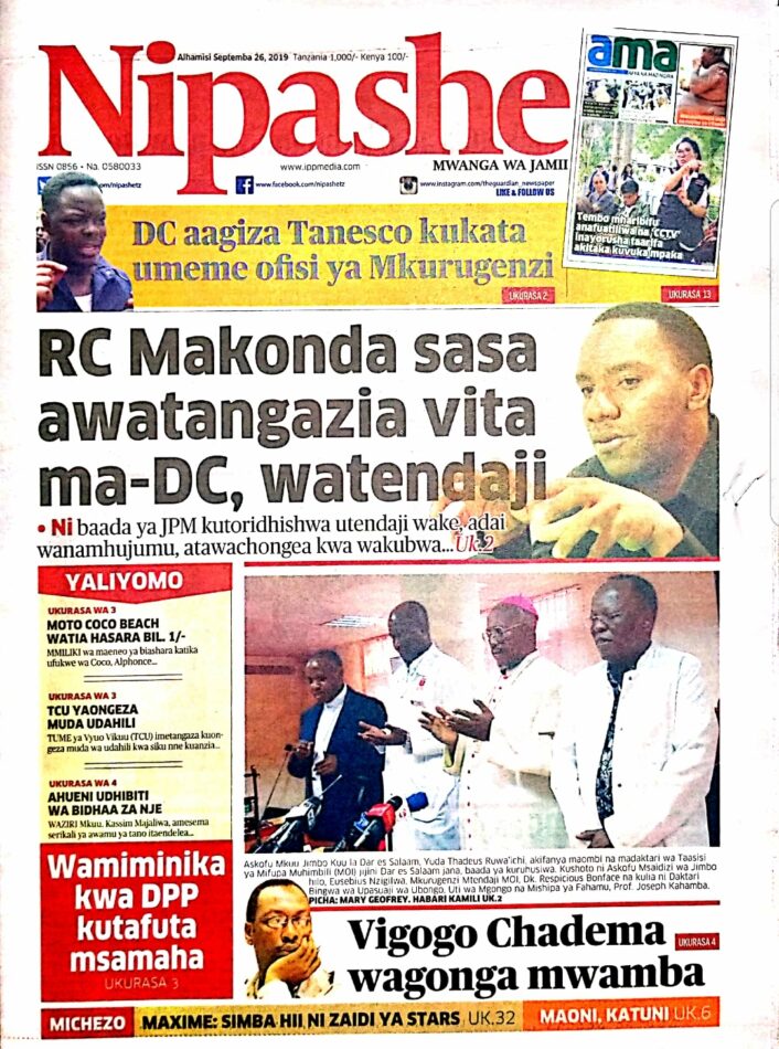 MagazetiPITIA VICHWA VYA HABARI KATIKA MAGAZETI YA LEO ALHAMISI SEPTEMBER 26,2019 Last updated: 2019/09/26 at 3:56 AM Alex Sonna 7 years ago Share SHARE Alex Sonna September 26, 2019 September 26, 2019 Share this Article Facebook Twitter Email Print Previous Article Waziri wa Maji Asitisha Vibali vya Ujenzi wa Miradi kwa Wakandarasi kwa Kukosa Uadilifu Next Article RUMBESA YAWASONONESHA WAKULIMA WA VIAZI,VITUNGUU MBEYA