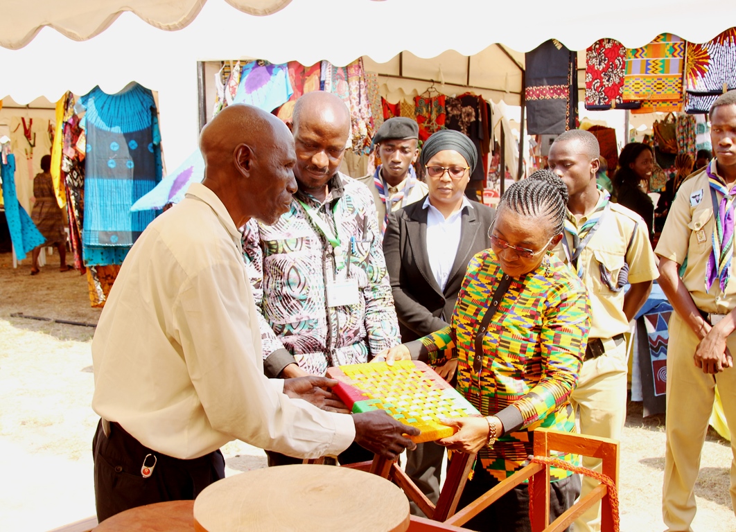 Naibu Waziri wa Viwanda na Biashara, Mhandisi Stella Manyanya (kulia) akiangalia stuli iliyotengenezwa na mlemavu wa macho wakati Naibu Waziri huyo alipotembelea maonesho ya Tamasha la Utamaduni wa Nchi za Afrika Mashariki hii leo katika Uwanja wa Taifa jijini Dar es Salaam.