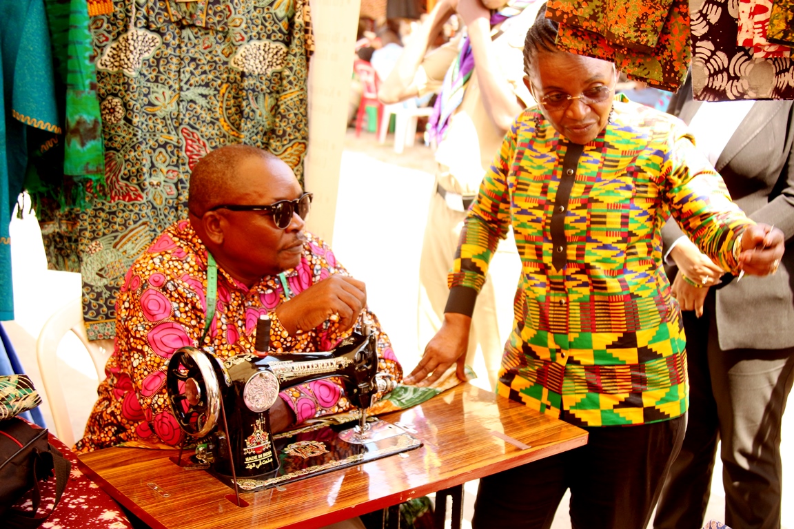 Naibu Waziri wa Viwanda na Biashara, Mhandisi Stella Manyanya (kulia) akifafanua jambo kwa fundi wa kushona nguo ambaye ni mlemavu wa macho wakati Naibu Waziri huyo alipotembelea maonesho ya Tamasha la Utamaduni wa Nchi za Afrika Mashariki hii leo katika Uwanja wa Taifa jijini Dar es Salaam.