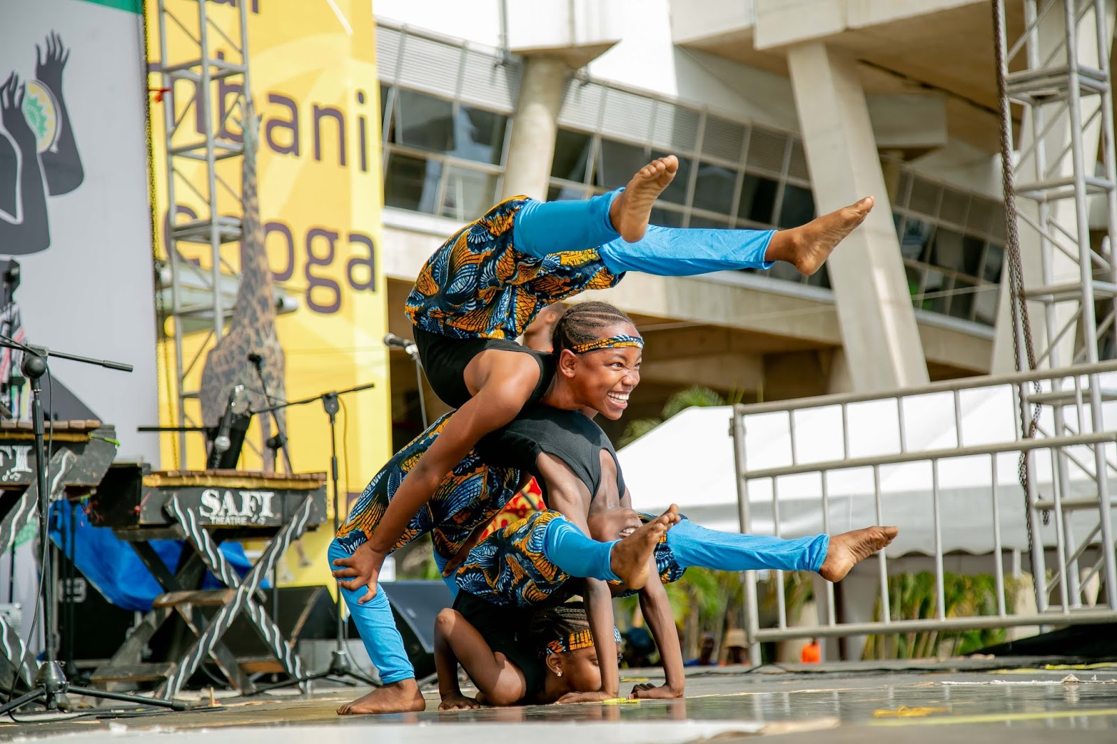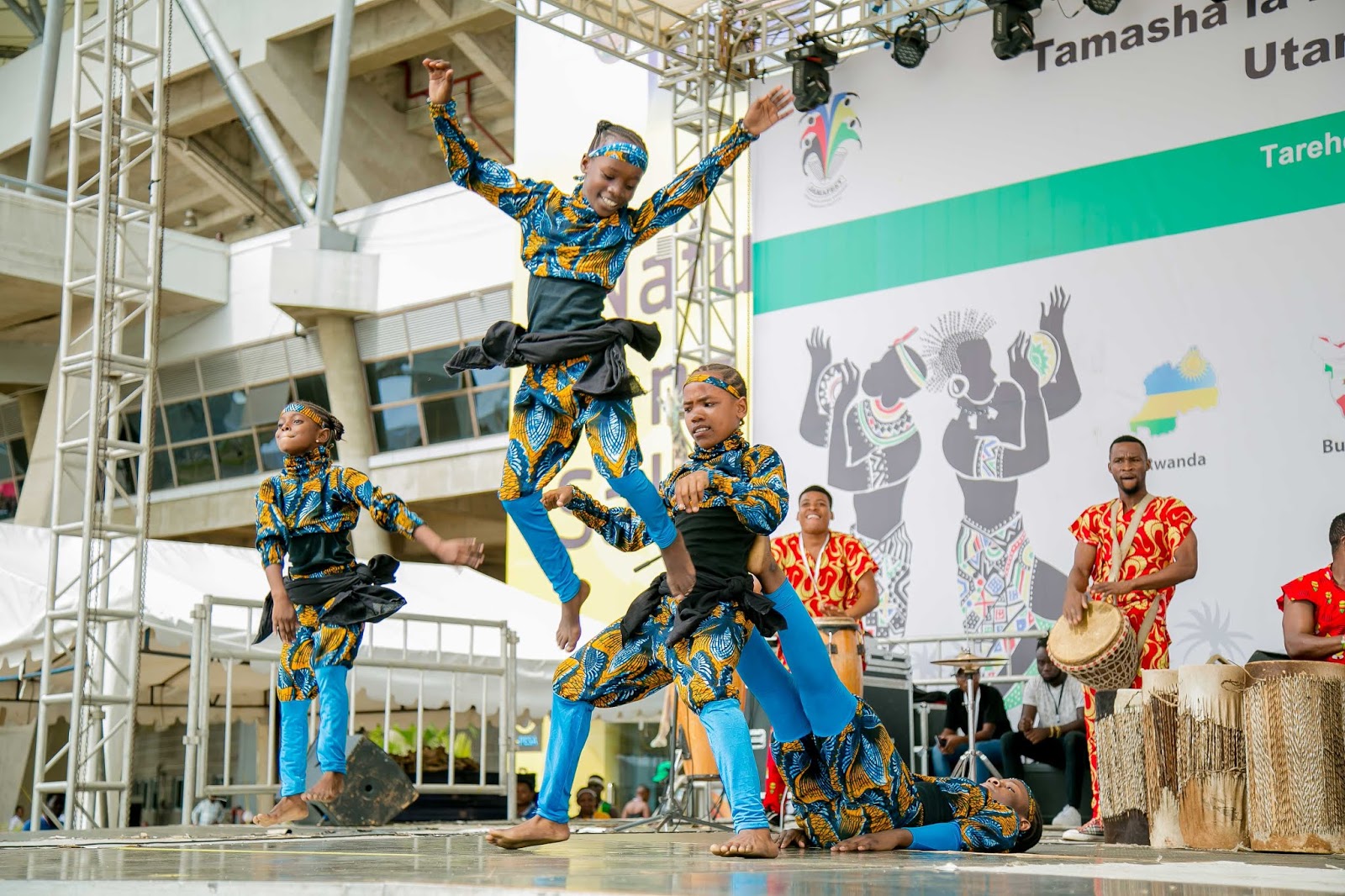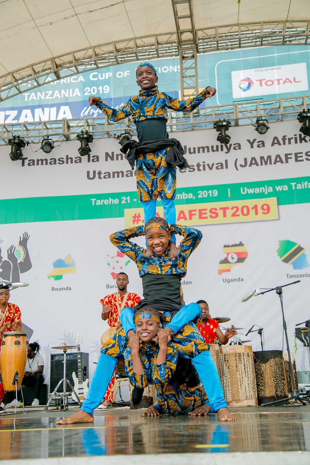 Vijana wa Kikundi cha ngoma na sarakasi cha Safi wakionyesha umahili wao katika Tamasha la Sanaa na Utamaduni la Jumuiya ya Afrika Mashariki linalojulikana kama JAMAFEST linalofanyika jijini Dar es Salaam, Tanzania. Tamasha hilo limeanza Septemba 21 na linatarajiwa kuisha 28, 2019.