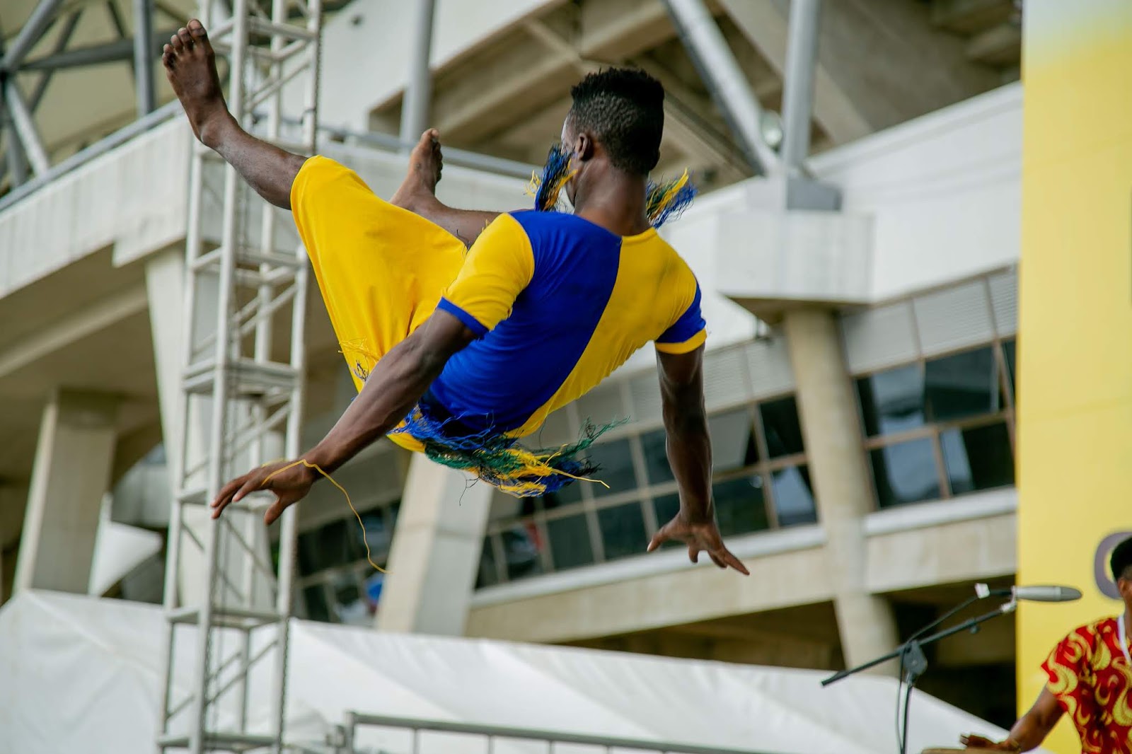 Mmoja ya kijana wa kikundi cha ngoma na sarakasi cha Safi kutoka Tanzania akionyesha umahili wake wa kucheza kwa kutumia shingo na mikono katika Tamasha la Sanaa na Utamaduni la Jumuiya ya Afrika Mashariki linalojulikana kama JAMAFEST linalofanyika jijini Dar es Salaam, Tanzania. Tamasha hilo limeanza Septemba 21 na linatarajiwa kuisha 28, 2019.