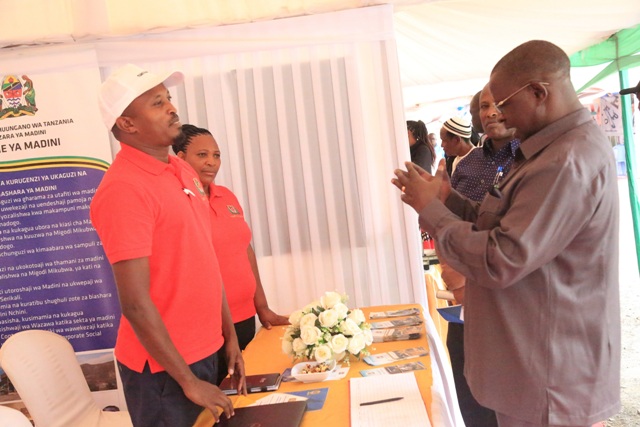 Mhandisi Migodi wa Wizara ya Madini, Johnbosco Karungamye (katikati) akielezea majukumu ya Wizara kwa Mjumbe wa Kamati Kuu ya Chama cha Mapinduzi (CCM), Kanali Mstaafu Ngemela Lupinga (kushoto) kwenye Maonesho ya Teknolojia na Uwekezaji wa Madini yanayoendelea mjini Geita tarehe 27 Septemba, 2019.