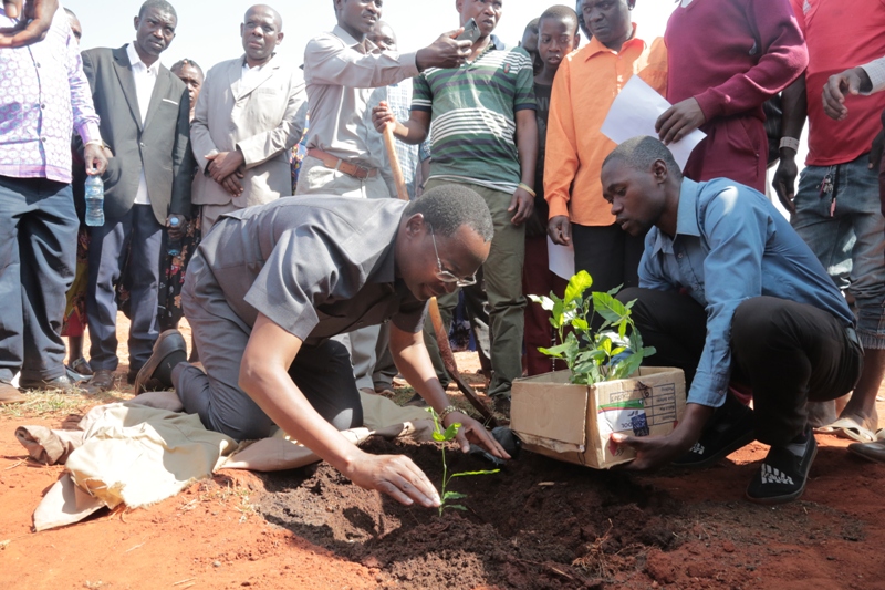 Waziri wa Nchi Ofisi ya Makamu wa Rais (Muungano na Mazingira) Mhe. George Simbachawene akipanda mti eneo la ya Sekondari Pwaga.
