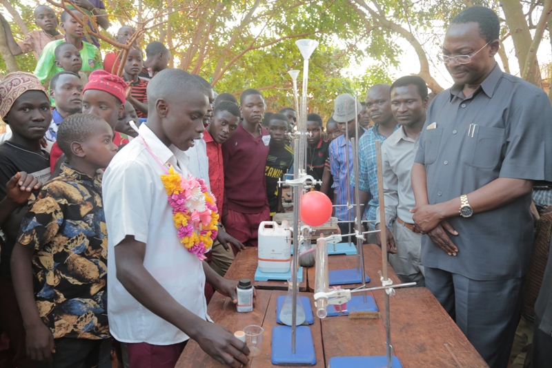 Waziri wa Nchi Ofisi ya Makamu wa Rais (Muungano na Mazingira) Mhe. George Simbachawene (kulia) akipata maelezo kutoka kwa mwanafunzi wa masomo ya sayansi kwa vitendo katika Shule ya Sekondari Pwaga.