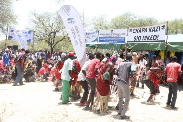 Vikundi vya ulinzi wa jamii (Sungusungu) vikiwasili kwenye uzinduzi wa kampeni hiyo kwa kucheza ngoma za asili ya kabila la kisukuma.