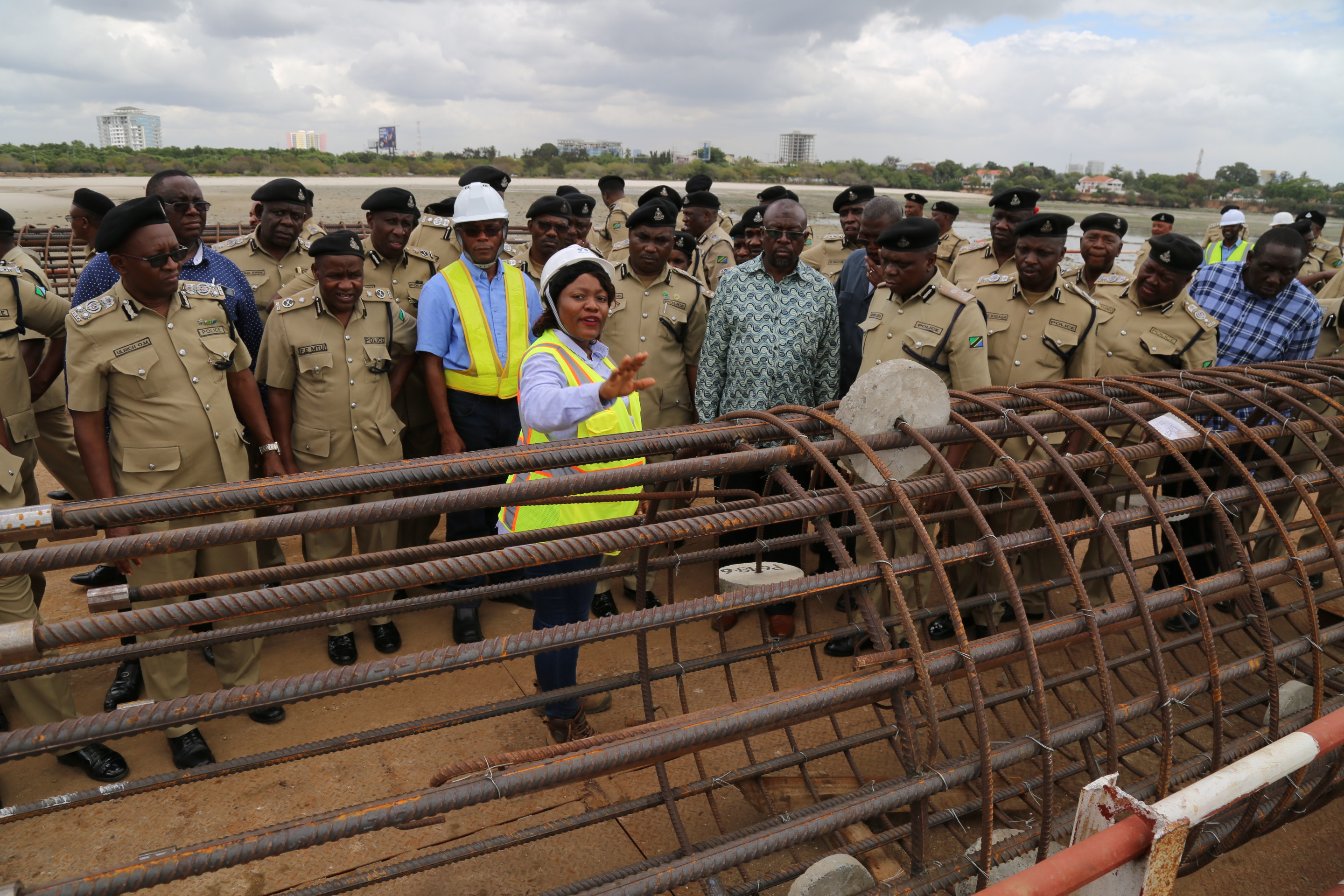 Mhandisi Lulu Levira wa Daraja jipya la Salender akitoa maelezo kwa Maafisa Wakuu Waandamizi na Makamanda wa Polisi wa Mikoa na Vikosi walipotembelea Mradi huo unaoendelea na ujenzi. Picha na Jeshi la Polisi.