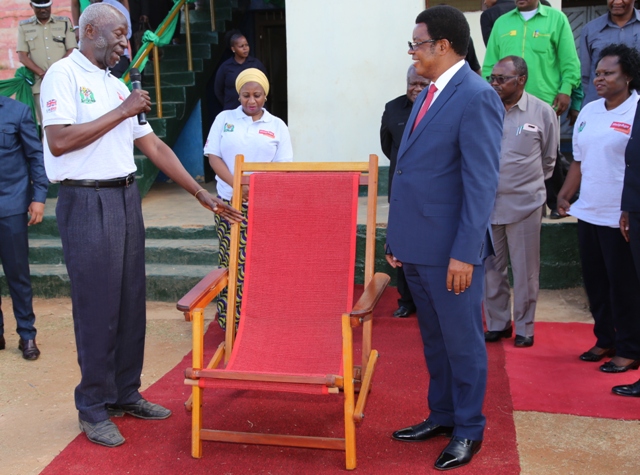 Waziri Mkuu, Kassim Majaliwa akikabidhiwa zawadi ya kiti cha wazee na Mwenyekiti wa Mtandao wa Wazee Tanzania, Abdallah Majumba (kushoto) baada ya kuhutubia katika Maadhiisho ya Siku ya Wazee Duniani yaliyofanyika kitaifa kwenye Uwanja wa Nangwada Sijaona mjini Mtwara, Oktoba 1, 2019. Katikati ni Waziri wa Afya, Maendeleo ya Jamii, Jinsia, Wazee na Watoto, Ummy Mwalimu.