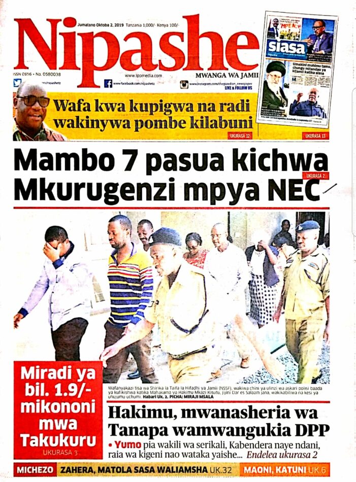 MagazetiPITIA VICHWA VYA HABARI KATIKA MAGAZETI YA LEO JUMATANO OKTOBA 2,2019 Last updated: 2019/10/02 at 3:12 AM Alex Sonna 6 years ago Share SHARE Alex Sonna October 2, 2019 October 2, 2019 Share this Article Facebook Twitter Email Print Previous Article BASHE AWATAKA MAAFISA UGANI KUTUMIA FOMU MAALUM KUKUSANYA TAARIFA ZA WAKULIMA Next Article SERIKALI KUSHIRIKIANA NA TAASISI MBALIMBALI KUBORESHA AFYA YA WANYAMA