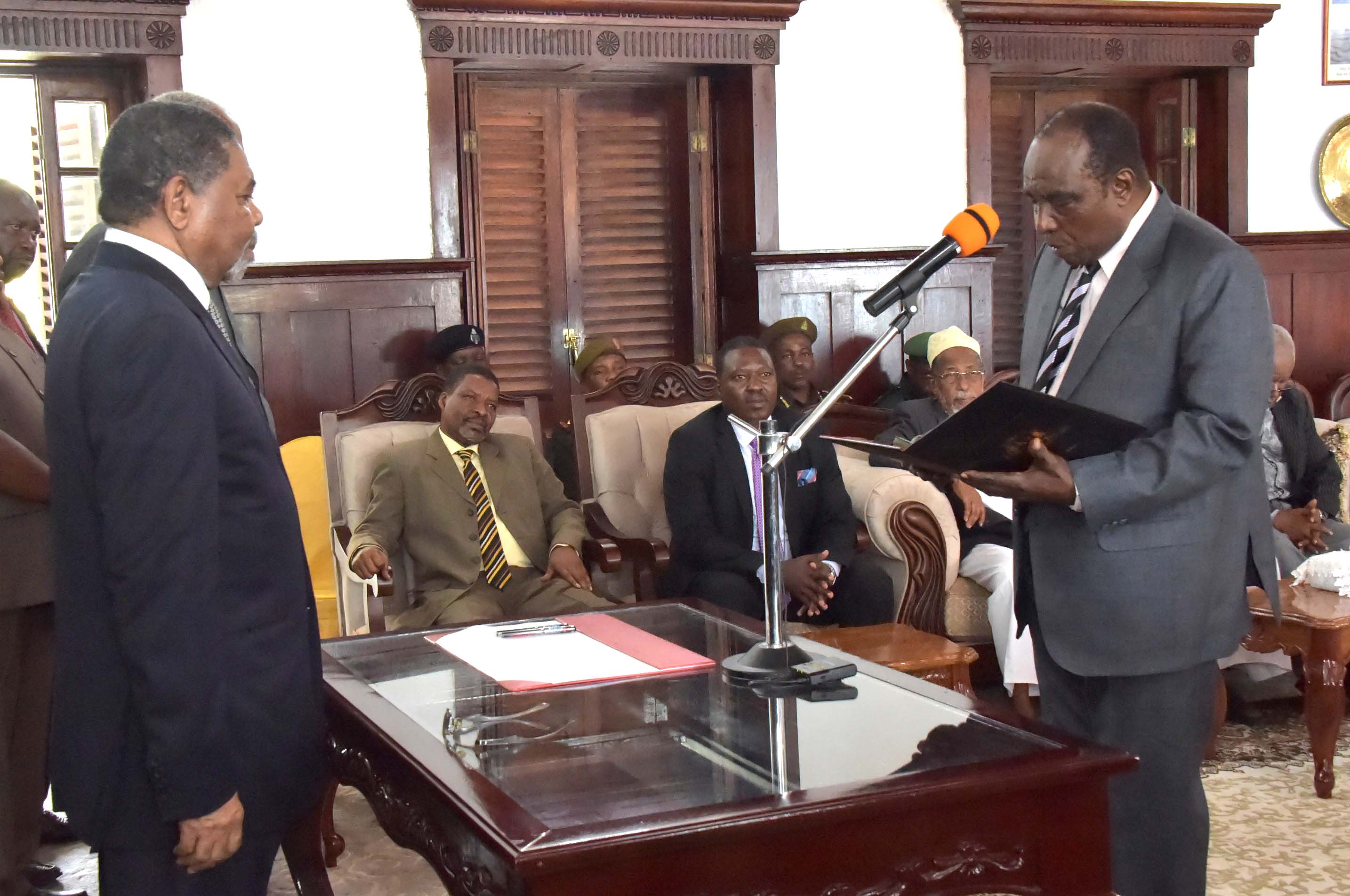 Rais wa Zanzibar na Mwenyekiti wa Baraza la Mapinduzi Dk.Ali Mohamed Shein (kushoto) akimuapisha Bw.Abdalla Rashid Abdulla kuwa Mshauri wa Rais Mambo ya Siasa katika iliyofanyika leo ukumbi wa Ikulu Mjini Zanzibar