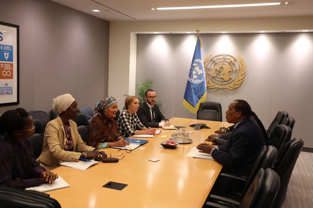 Naibu Katibu Mkuu wa Umoja wa Mataifa Dkt. Amina Mohammed na baadhi ya wajumbe wake wakiwa katika mazungumzo na Waziri wa Mambo ya Nje na Ushirikiano wa Afrika Mashariki Prof. Palamagamba John Kabudi na wajumbe wake (hawapo pichani) katika ofisi za Umoja wa Mataifa zilizopo New York Marekani.