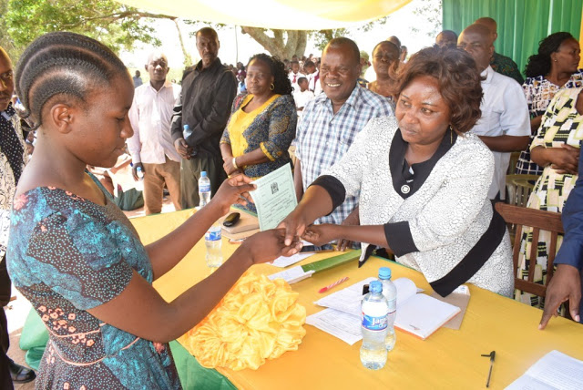 Mmoja wa wahitimu elimu ya watu wazima wilayani Misungwi aakipokea cheti kutoka kwa mgeni rasmi.