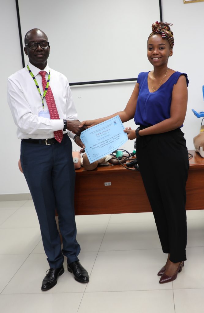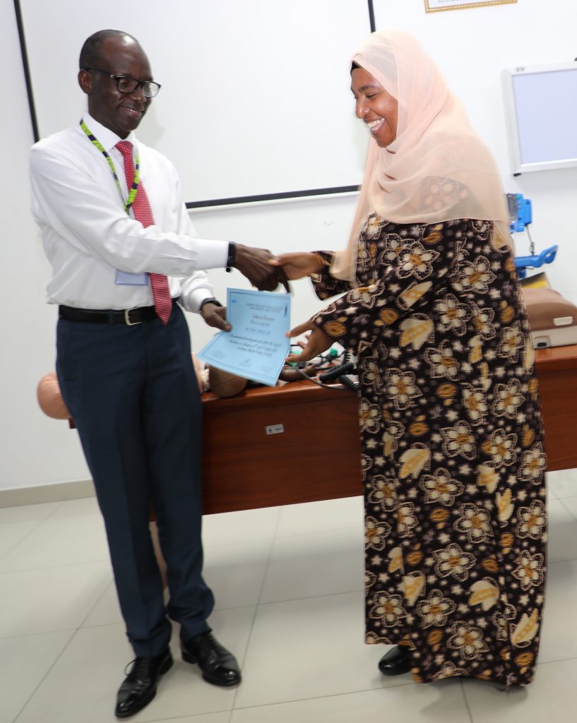 Mkurugenzi Mtendaji wa Taasisi ya Moyo Jakaya Kikwete (JKCI) Prof. Mohamed Janabi akimkabidhi Daktari wa usingizi na wagonjwa walioko katika chumba cha uangalizi maalum (ICU) wa Hospitali ya Taifa Muhimbili-Mloganzila Nsia Mushi heti cha ushiriki wa mafunzo ya siku mbili ya kutoa huduma za dharula na jinsi ya kuwahudumia wagonjwa wanaohitaji uangalizi maalum. Jumla ya washiriki 75 kutoka Hospitali za Taifa Muhimbili (MNH), Taasisi ya Mifupa MOI, Amana, Mwananyamala, Temeke na Mloganzila walihudhuria mafunzo hayo yaliyoandaliwa na JKCI Idara ya usingizi na wagonjwa walioko katika uangalizi maalum.