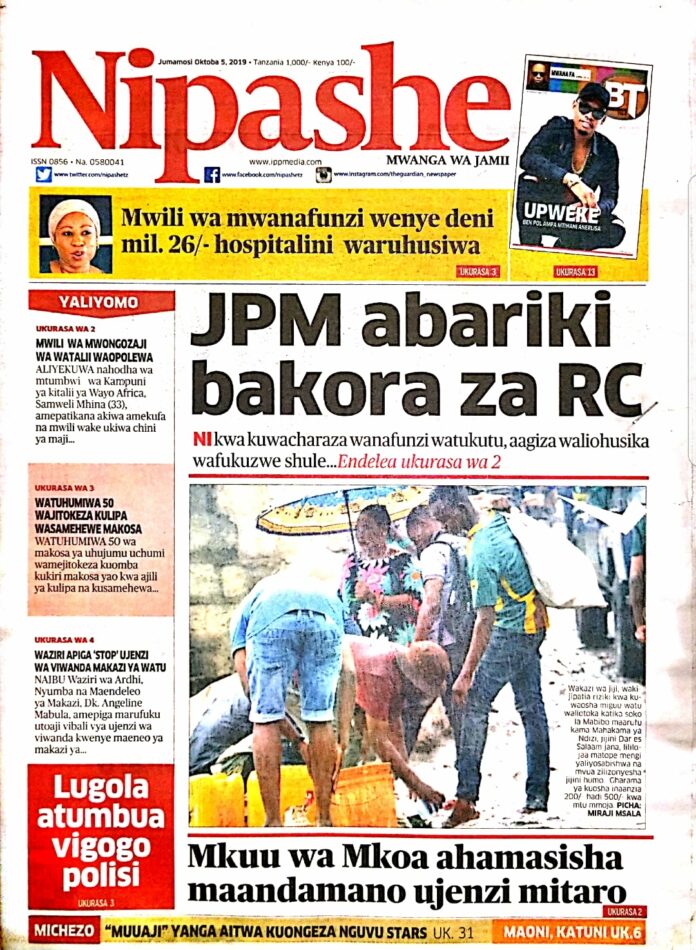 MagazetiPITIA VICHWA VYA HABARI KATIKA MAGAZETI YA LEO JUMAMOSI OKTOBA 5,2019 Last updated: 2019/10/05 at 3:40 AM Alex Sonna 7 years ago Share SHARE Alex Sonna October 5, 2019 October 5, 2019 Share this Article Facebook Twitter Email Print Previous Article TAASISI YA SACHIA SOCIETY KUWAPA WATOTO 100 BIMA ZA AFYA Next Article Wafugaji kutumia Simu kuyafata Malisho na Maji