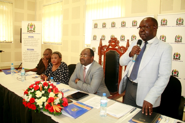 Katibu Mkuu, Wizara ya Elimu, Sayansi na Teknolojia, Dkt. Leonard Akwilapo akizungumza na Mkuu wa Kitengo cha Mawasiliano Wizara ya Elimu, Sayansi na Teknolojia Bi.Sylivia Lupembe katikati ni Katibu Mtendaji wa NACTE, Dr. Adolf Rutayuga.