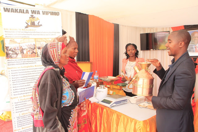 Afisa Vipimo Mwandamizi wa Wakala wa Vipimo, Wilue Amos akitoa maelezo kwa wananchi waliotembelea banda lao kuhusu kifaa cha kupimia pampu za mafuta kinavyofanya kazi. Wa pili kulia ni Katibu Mahsusi (PS) wa Wakala wa Vipimo Mkoa wa Singida, Grace Severe.