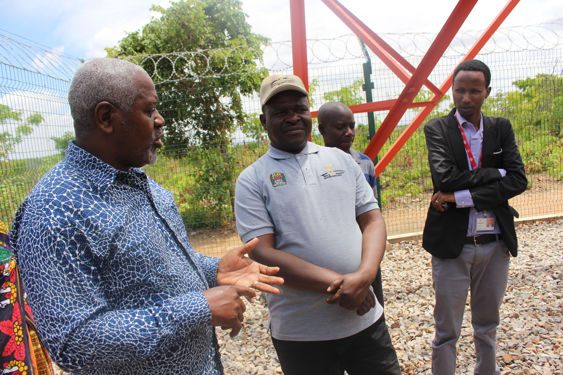 Mkuu wa uendeshaji wa Mfuko wa Mawasiliano kwa Wote, Mhandisi Albert Richard akitoa taarifa kwa Naibu Waziri wa Uchukuzi na Mawasiliano, Mhandisi Atashasta Nditiye (wa kwanza kushoto) kuhusu mnara wa Ilolangulu wakati wa ziara yake ya kukagua upatikanaji wa mawasiliano Mbogwe mkoani Geita.