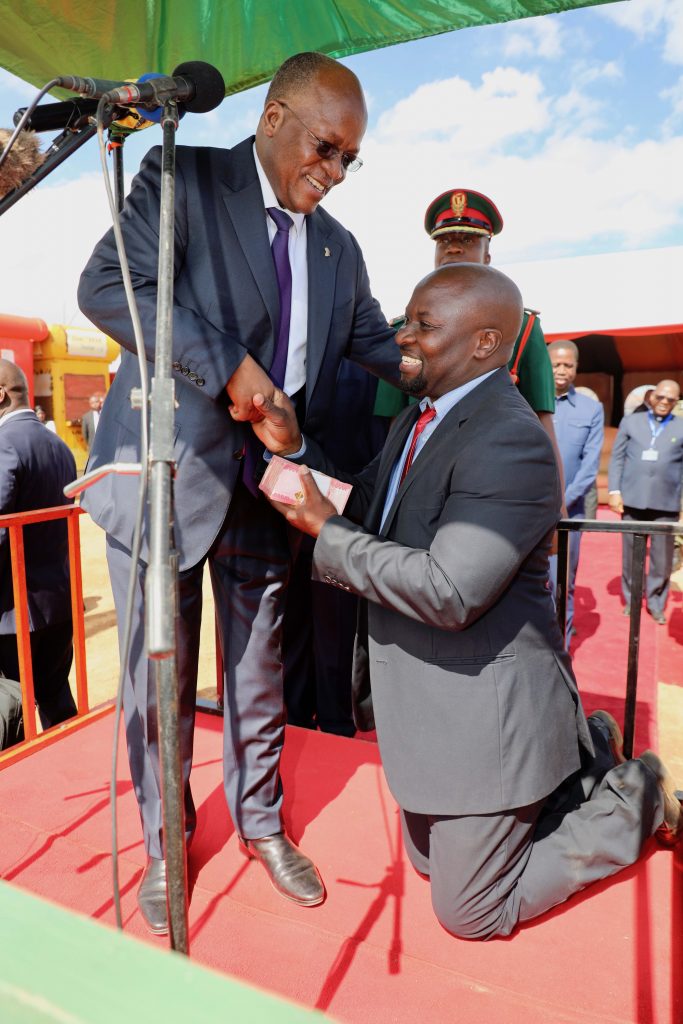 Rais Dkt John Pombe Magufuli akimsihi Mkuu wa Wilaya ya Nakonde Bw. Alex Sinkala kusimama baada ya kumpigia magoti kumshukuru kwa masada wa shilingi milioni tano taslimu ili kusaidia ujenzi wa Shule ya Sekondary ya Nakonde wakati akihutubiua wananchi wa Zambia Katikamkutano wa hadhara baada ya uzinduzi wa Kituo cha Mpakani cha Nakonde-Tunduma One-Stop Border Post upande wa Zambia Leo Jumamosi