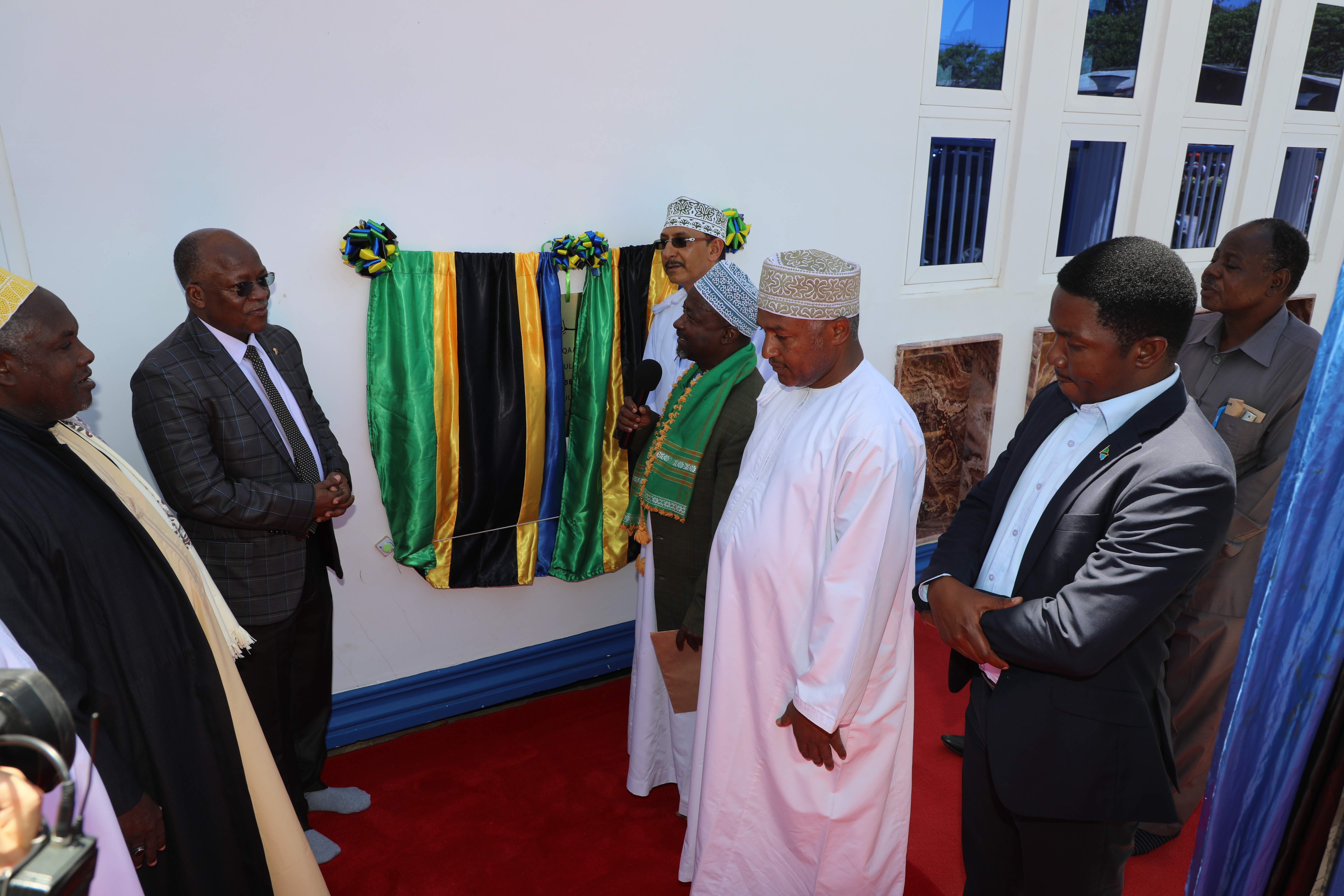 Rais wa Jamhuri ya Muungano wa Tanzania Dkt. John Pombe Magufuli akiwa na Shehe Mkuu wa Mkoa wa Rukwa Shehe Rashidi Akilimali na viongozi wengine akikata utepe kuufungua rasmi msikiti wa Istiqaama Bomani wa Mjini Sumbawanga leo Jumatatu Oktoba 7, 2019