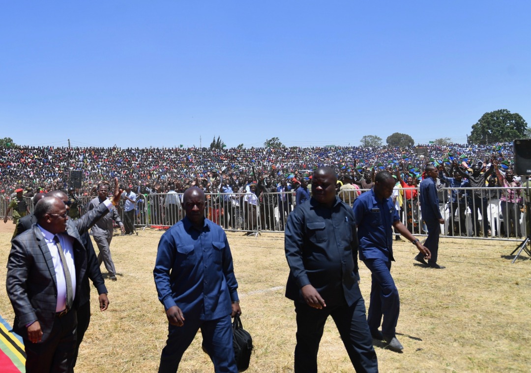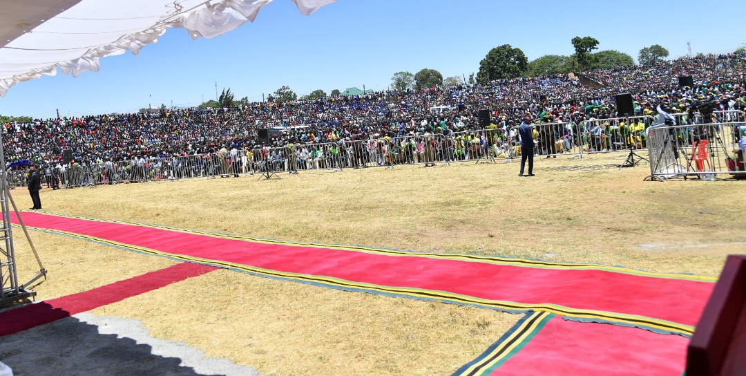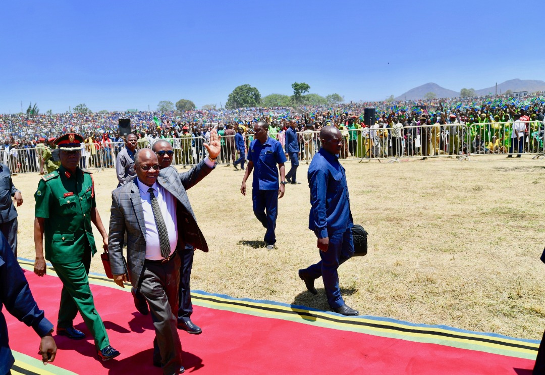 Rais wa Jamhuri ya Muungano wa Tanzania Mheshimiwa Dkt. John Pombe Magufuli akiwapungia mkono wananchi wa Sumbawanga mara baada ya kuwasili katika Uwanja wa mpira wa Nelson Mandela kwa ajili ya kuwahutubia.