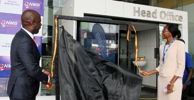 Kaimu Mkurugenzi Mtendaji wa Benki ya NMB Bi. Ruth Zaipuna na Ofisa Mkuu wa Wateja Binafsi na Biashara Ndogo na za Kati wa benki ya NMB Bw. Filbert Mponzi wakizindua huduma mpya ya dijitali katika kupata huduma za kibenki ijulikanayo kama “NMB Mkononi” katika makao makuu ya benki hiyo jijini Dar es salaam jana.