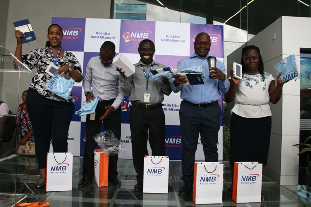 Baadhi ya wafanyakazi wa NMB waliojishindia zawadi wakionesha zawadi zao.