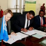 Kaimu Mkurugenzi Mtendaji wa Benki ya NMB Bi. Ruth Zaipuna na Ofisa Mkuu wa Wateja Binafsi na Biashara Ndogo na za Kati wa benki ya NMB Bw. Filbert Mponzi wakinyoosha bendera ya benki hiyo juu kuashiria uzinduzi wa kampeni ya huduma mpya ya dijitali katika kupata huduma za kibenki ijulikanayo kama “NMB Mkononi” katika makao makuu ya benki hiyo jijini Dar es salaam jana.