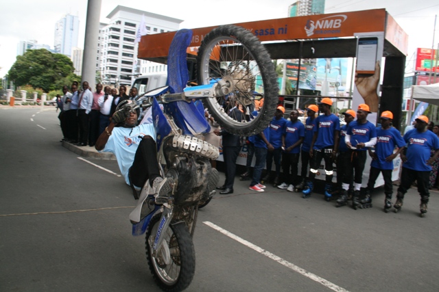 Waenedsha pikipiki wakionesha michezo mbalimbali kwa kutumia pikipiki kubwa katika uzinduzi huo.