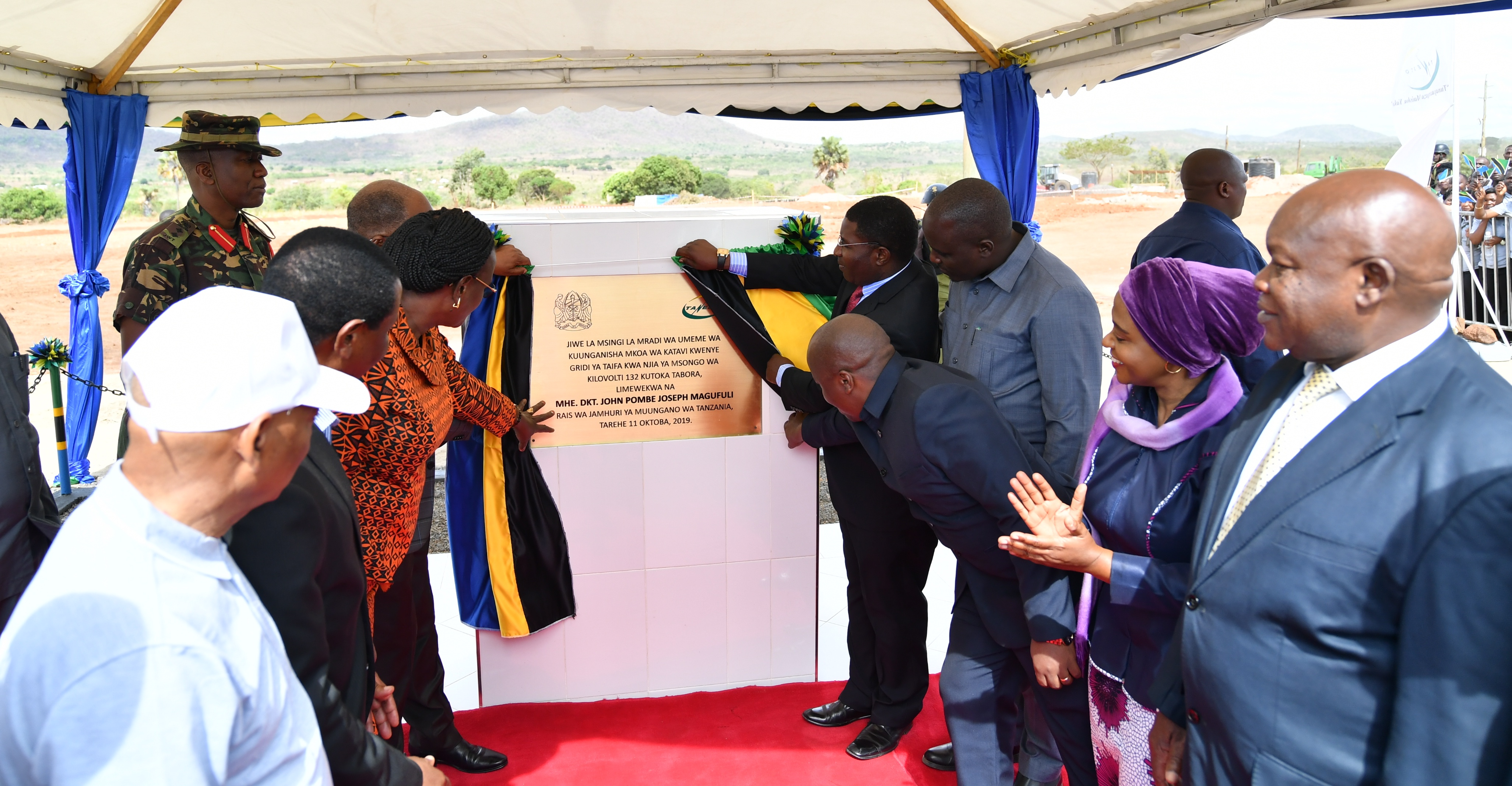 Rais wa Jamhuri ya Muungano wa Tanzania Mheshimiwa Dkt. John Pombe Magufuli akiwa na Mkewe Mama Janeth Magufuli, Waziri wa Nishati Dkt. Medard Kalemani, Viongozi wa Mkoa wa Katavi, Mawaziri pamoja na Wabunge akivuta utepe kuashiria uwekaji wa jiwe la msingi mradi wa umeme wa kuunganisha mkoa wa Katavi kwenye Gridi ya Taifa kwa njia ya msongo wa Kilovolti 132 kutoka mkoani Tabora katika sherehe fupi zilizofanyika nje kidogo ya manispaa ya Mpanda.