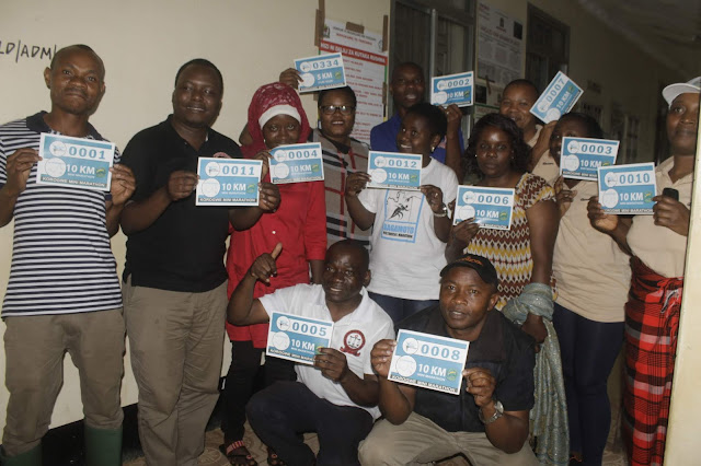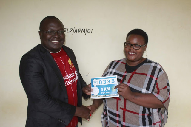 | MKUU wa wilaya ya Korogwe kulia Kissa Gwakisa akimkabidhi namba ya ushiriki mmoja wa wananchi wa wilaya ya Korogwe Magesa Kuboja ambao wamejitokeza kuajiandikisha kushiriki mashindano ya Korogwe Mini Marathoni yatakayofanyika leo Jumapili ambayo yameandaliwa na Mkuu huyo wa wilaya |