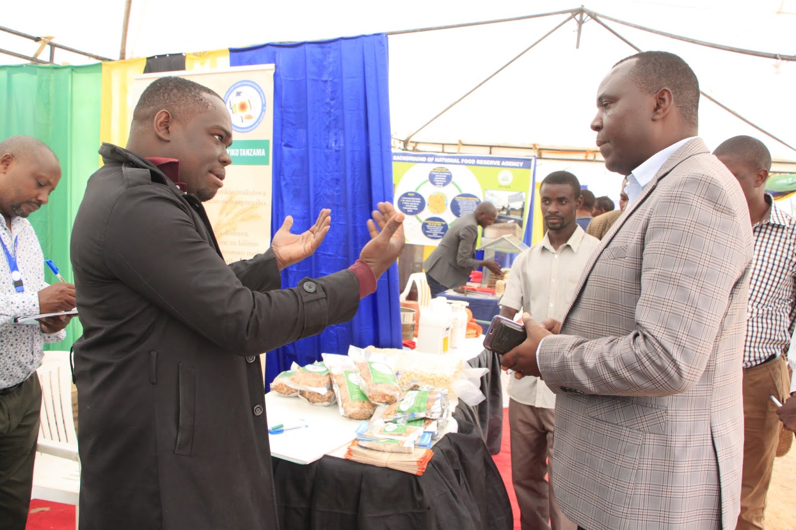 Afisa Ubora Bodi ya Nafaka na Mazao Mchanganyiko (CPB), Idd Mkolamasa, akimuelekeza jambo Mkuu wa Wilaya ya Singida, Paskas Muragili alipotembelea banda la CPB.