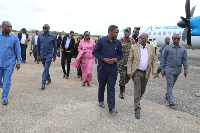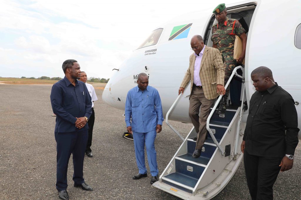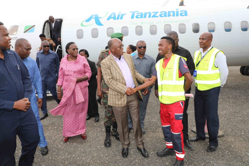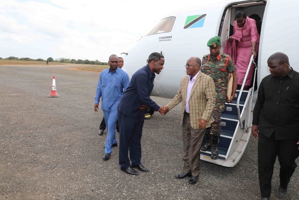 Magufuli akilakiwa na Mkuu wa Mkoa wa Mtwara Mhe. Gelasius Byakwanwa mara baada ya kushuka kutoka katika ndege aina ya Bombadier ya ATCL alipowasili tayari kuelekea mkoani Lindi kuhudhuria sherehe za kilele cha Mbio za Mwenge wa Uhuru na kumbukumbu ya Miaka 20 ya Kifo cha Baba wa Taifa Mwalimu Julius Nyerere